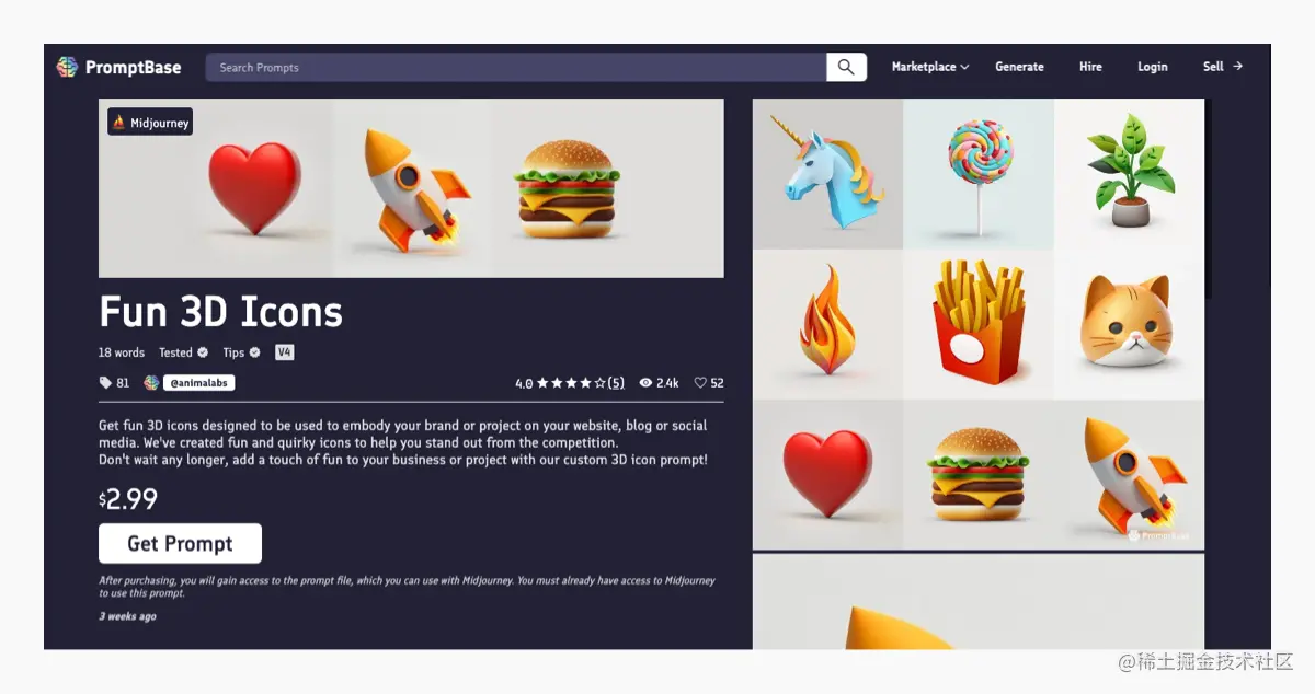 所幸AI在这个时候及时出现,无论是前几年流行的扁平插画,还是近年来流行的3D轻拟物风格都已经被AI拿捏得死死的,不信可以看看Promptbase上面大量成品描述词(Prompt)。