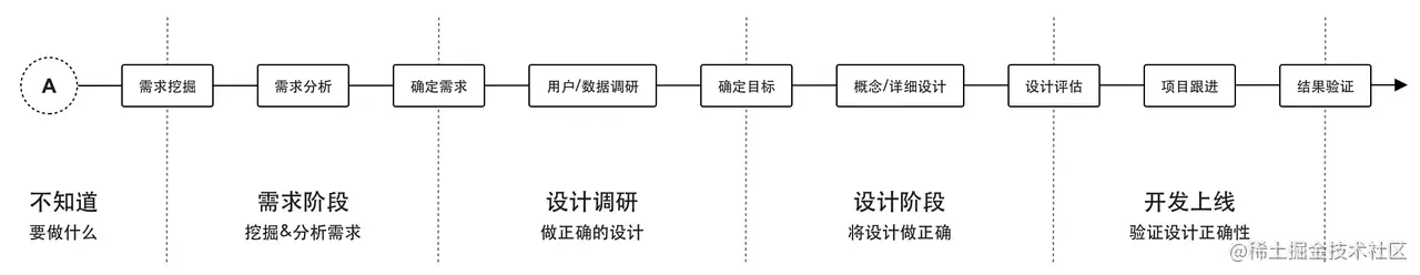 如果回到B端设计师的工作模式(如下图),会发现AI短期内能突破的还是只有设计和开发阶段的工作,至于需求和调研,甚至最终的结果验证和复盘阶段,AI都还很难做出有价值的工作。