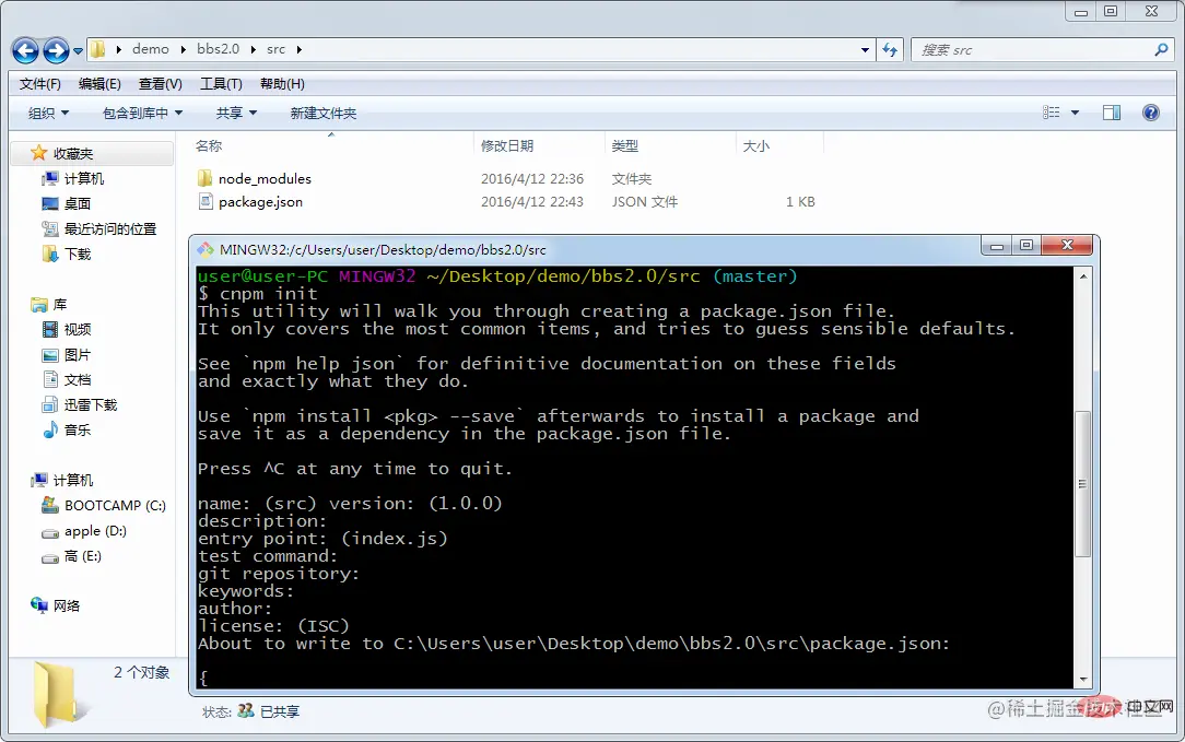 安装成功后,会出现node_modules文件夹,然后通过cnpm init来创建package.json(node项目配置文件:因为node插件包相对来说非常庞大,所以不加入版本管理,将配置信息写入package.json并将其加入版本管理,其他开发者对应下载即可)