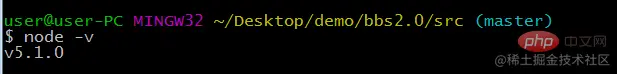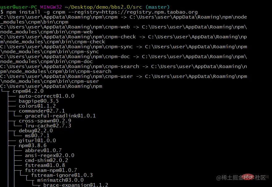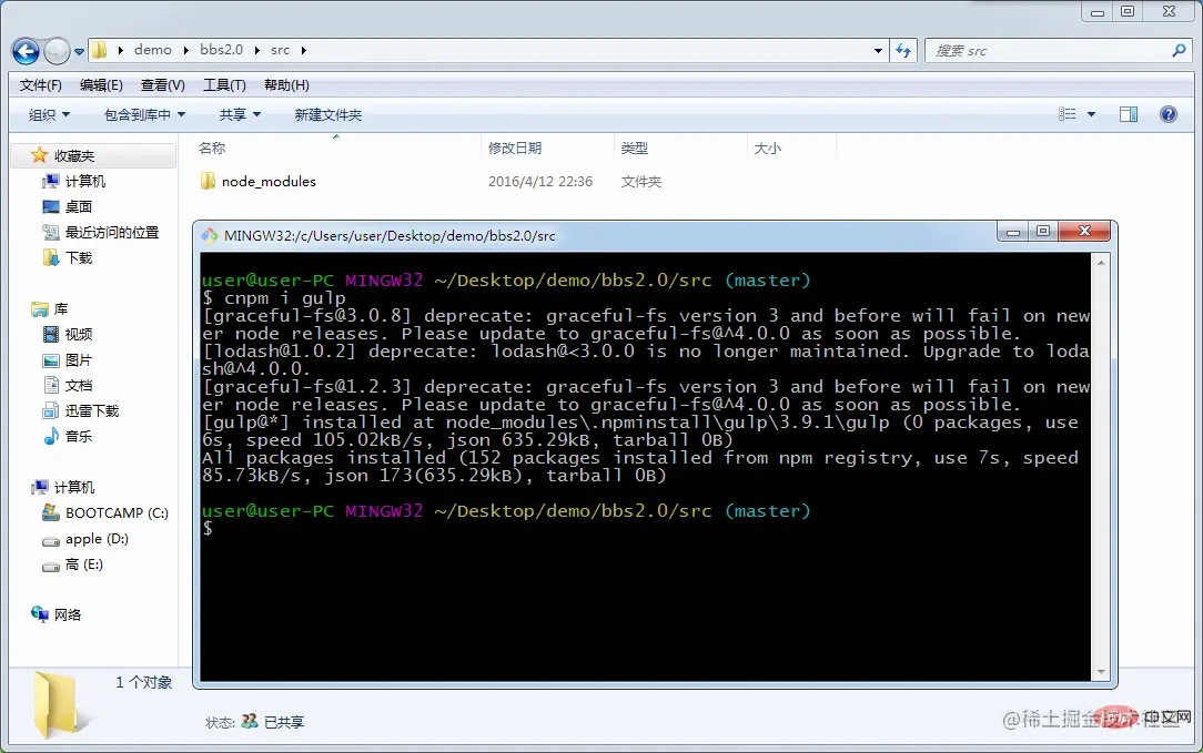然后进入桌面demo/bbs2.0/src下面,进入bash环境,用cnpm install gulp 来将gulp安装到当前目录下