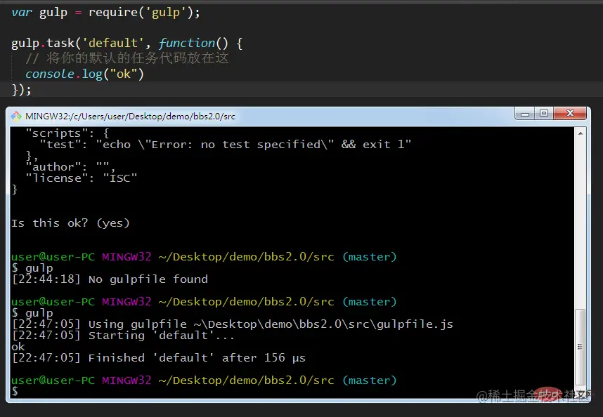 会发现打印出了我们需要的“ok”,到这里gulp基本就可以正常工作了。