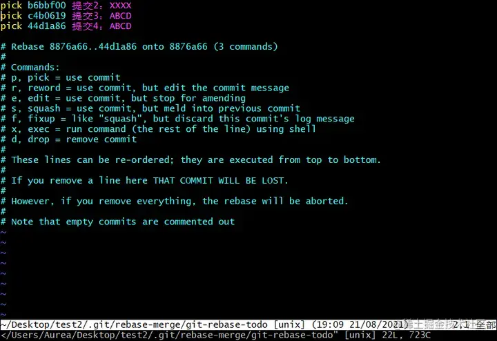 于是我们又进入了Vim界面, 可以在顶部看到提交2,3,4都可修改。