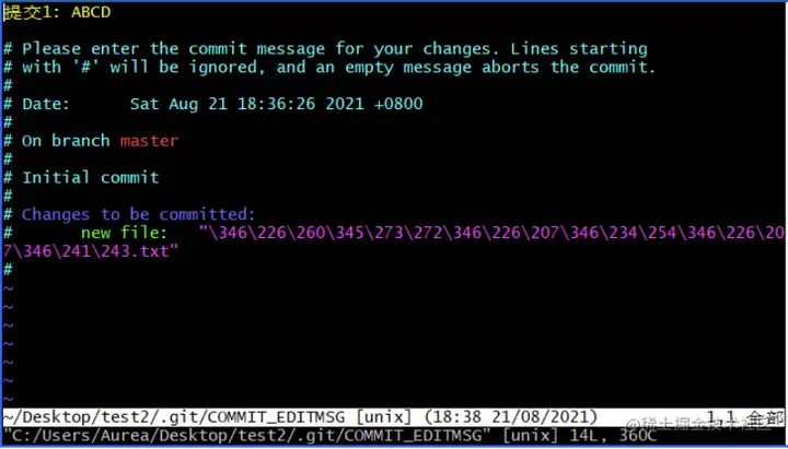 就可以进行修改,命令行会进入vim的界面,让你修改上一次的提交 Message,改好消息,退出即可。这里还涉及到了 vim 的基本操作,好像有些人也不熟悉,本文会做最基本的讲解。