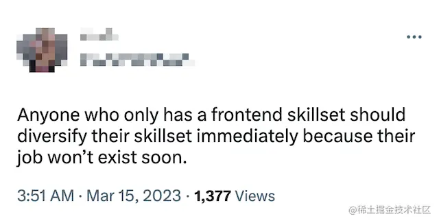 上图可以表达出在过去几个月里,前端开发人员的一种普遍的焦虑——他们已经看到了来自 GPT-4 等工具的越来越令人印象深刻的演示,他们担心当 AI 精通 HTML/CSS/JS 时,将没有任何工作留给他们。