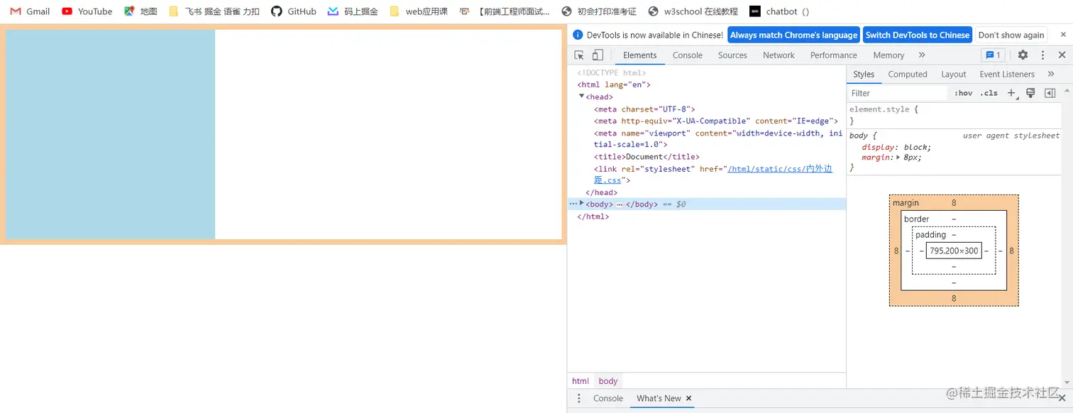 body会自带外边距(margin:8px),可以通过单独设置margin:0;消除这个外边距。