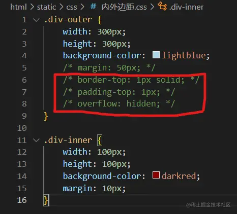 父元素与后代元素父元素没有上边框和padding时,后代元素的margin-top会溢出,溢出后父元素的margin-top会与后代元素取最大值。 - 问题二: