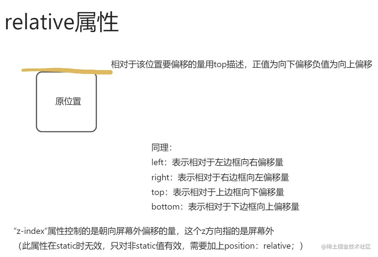 static(默认时的属性值):该关键字指定元素使用正常的布局行为,即元素在文档常规流中当前的布局位置。此时top,right,bottom,left和z-index属性无效。relative:该关键字下,元素先放置在未添加定位时的位置,再在不改变页面布局的前提下调整元素位置(因此会在此元素未添加定位时所在位置留下空白)。top,right,bottom,left等调整元素相对于初始位置的偏移量。