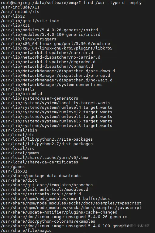 在上面的命令中,-type d指定查找的是目录类型,-empty选项指定查找空目录。