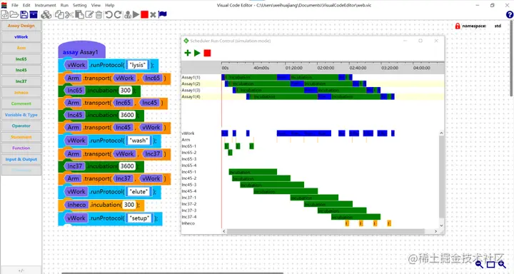 除了小游戏以外,WPF-Blockly 也可以将动态调度引擎整合到图形编程中,制作一个实验室自动化控制软件。