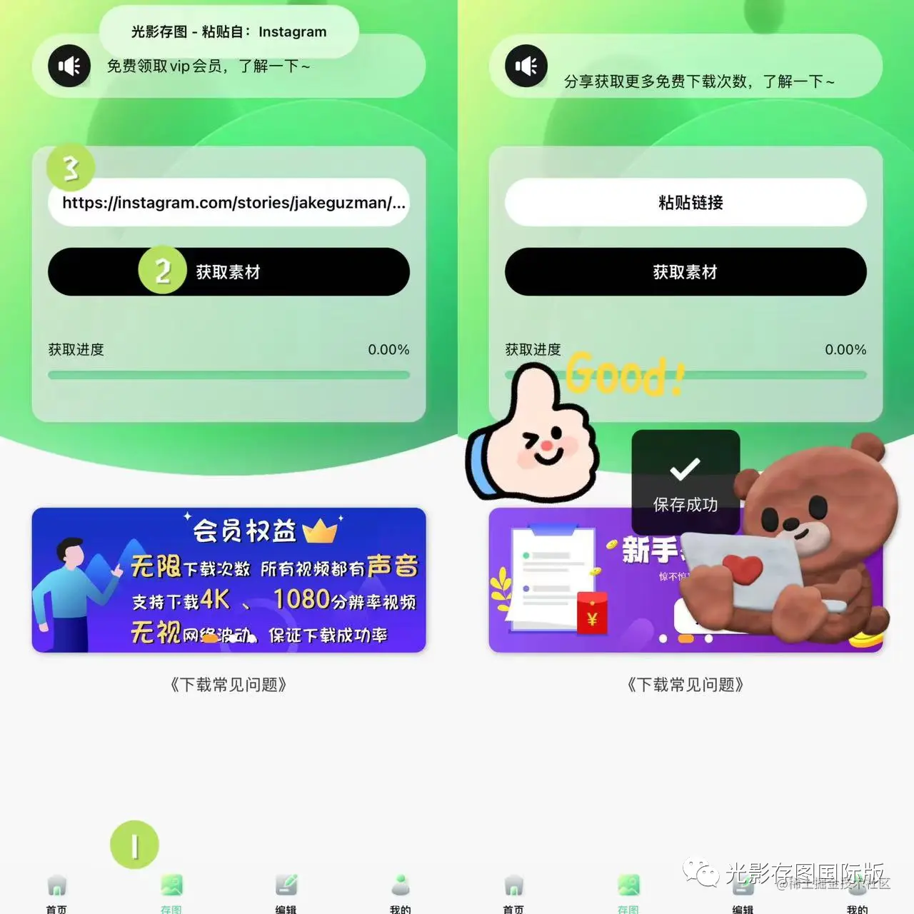 然后在【光影存图】app中找到最下方存图页面,将链接粘贴到空白格内再点击获取素材即可!然后就能看到保存成功的提示啦~~~
