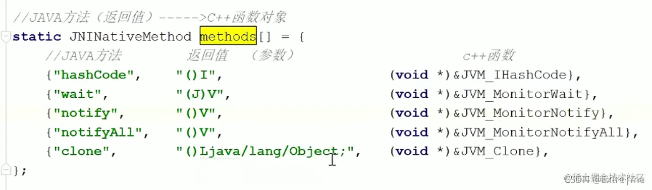在加载静态代码块的时候,会通过registerNatives()加载,通过method函数对java和c++方法做映射