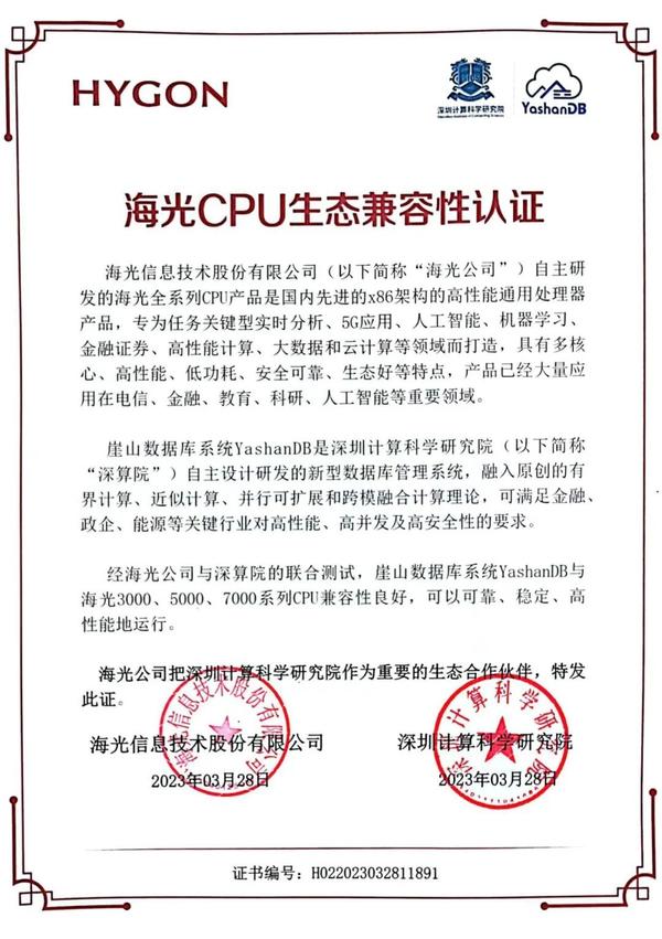 海光公司主要从事于高端处理器、加速器等计算芯片产品和系统的研究与开发。其自主研发的海光全系列CPU产品是国内先进的x86架构的高性能通用处理器产品,具有多核心、高性能、低功耗、安全可靠等特点,已在电信、金融、教育、人工智能等重要领域实现应用。经测试,崖山数据库系统YashanDB V22.1与海光3000、5000、7000系列处理器兼容性良好,整体运行状态平稳,性能表现卓越,能够满足企业安全性、可靠性和关键应用的需求。
