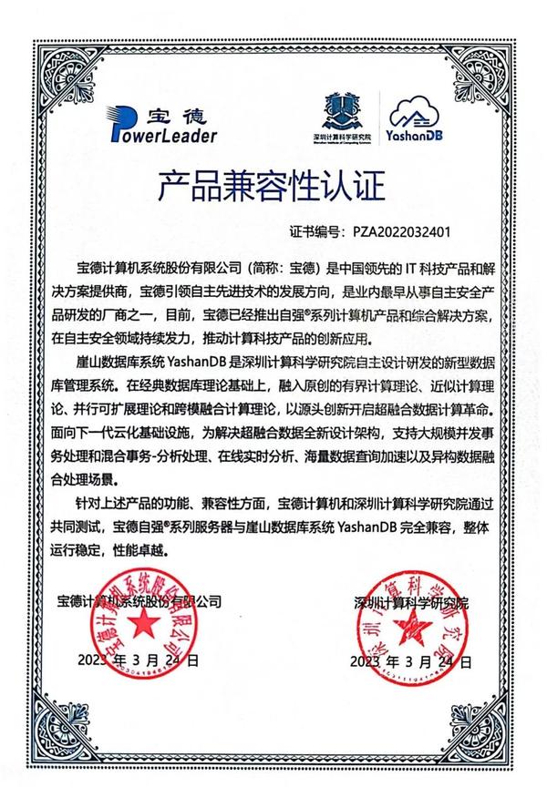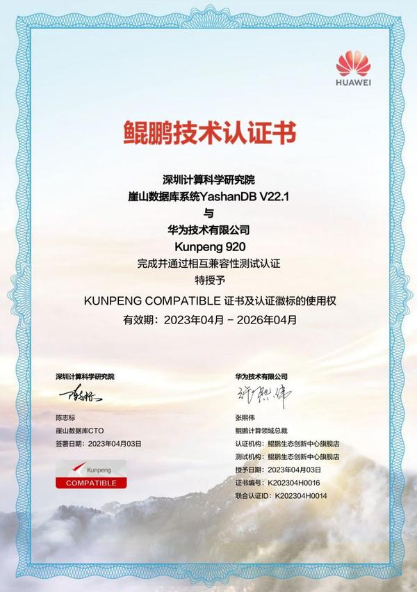 3月,崖山数据库系统YashanDB与华为技术有限公司(简称:华为)的鲲鹏920处理器,宝德计算机系统股份有限公司(简称:宝德计算)的宝德自强系列PR210K处理器,海光信息技术股份有限公司(简称:海光公司)的海光3000、5000、7000系列处理器三家公司共计5款产品完成兼容互认证。