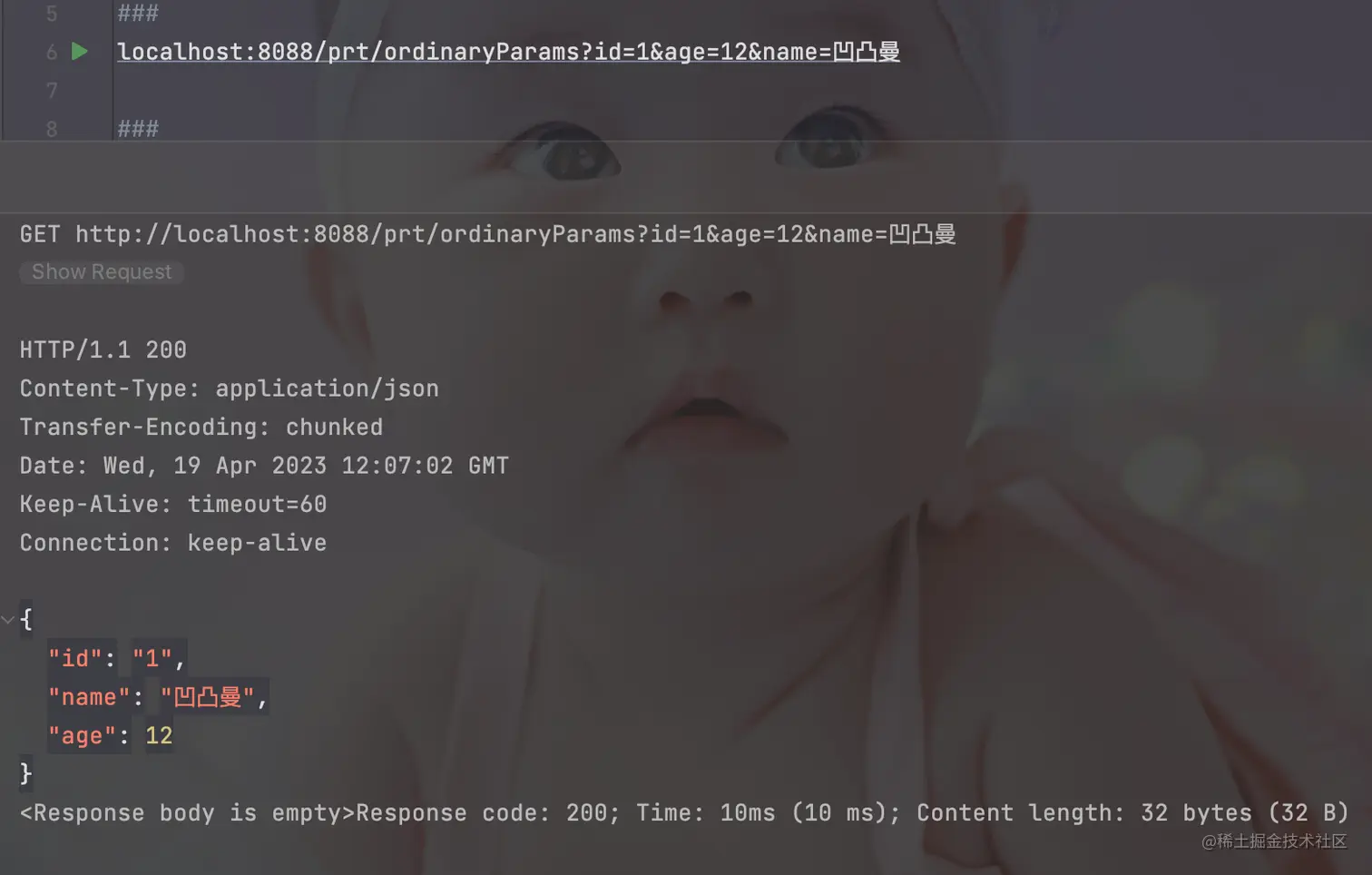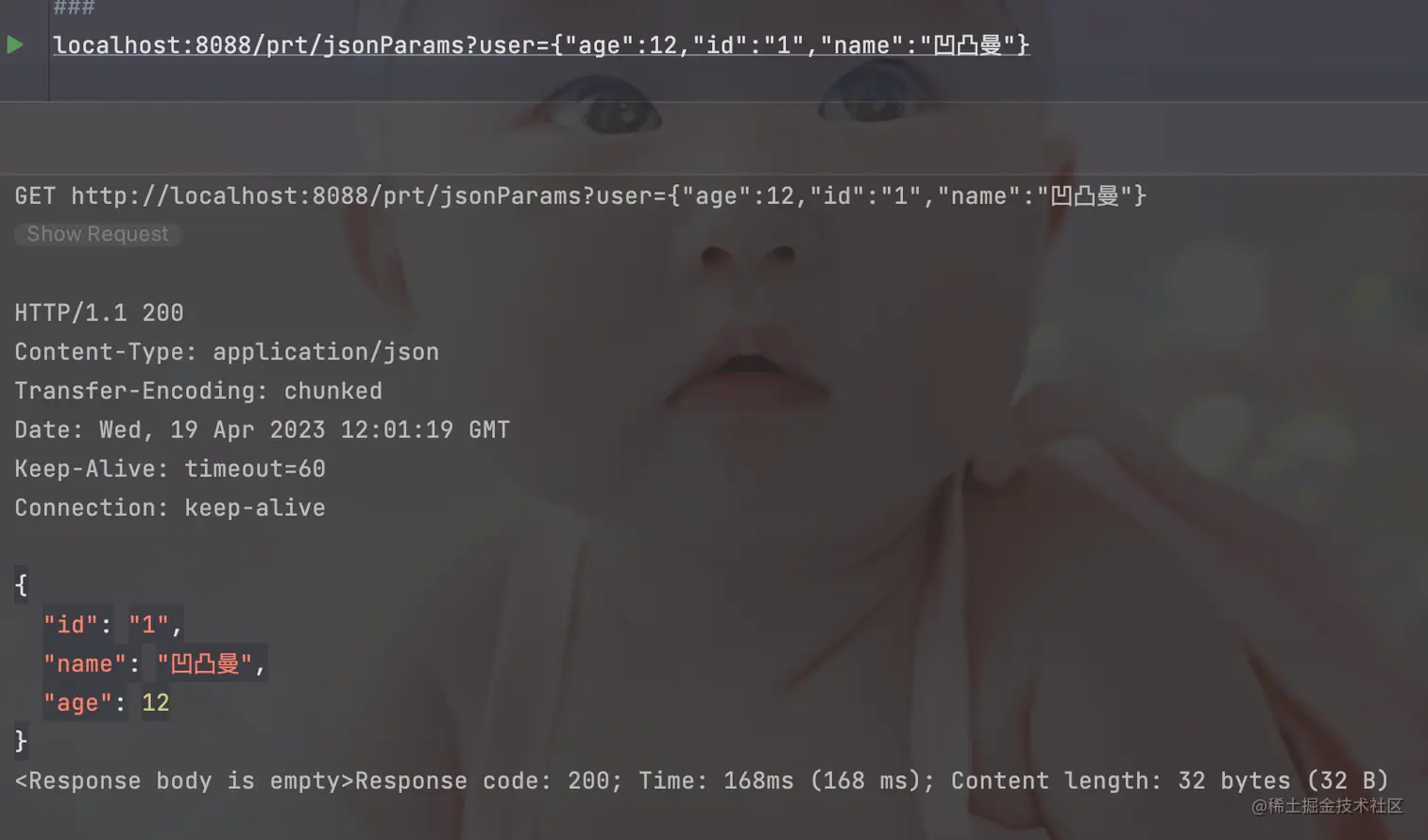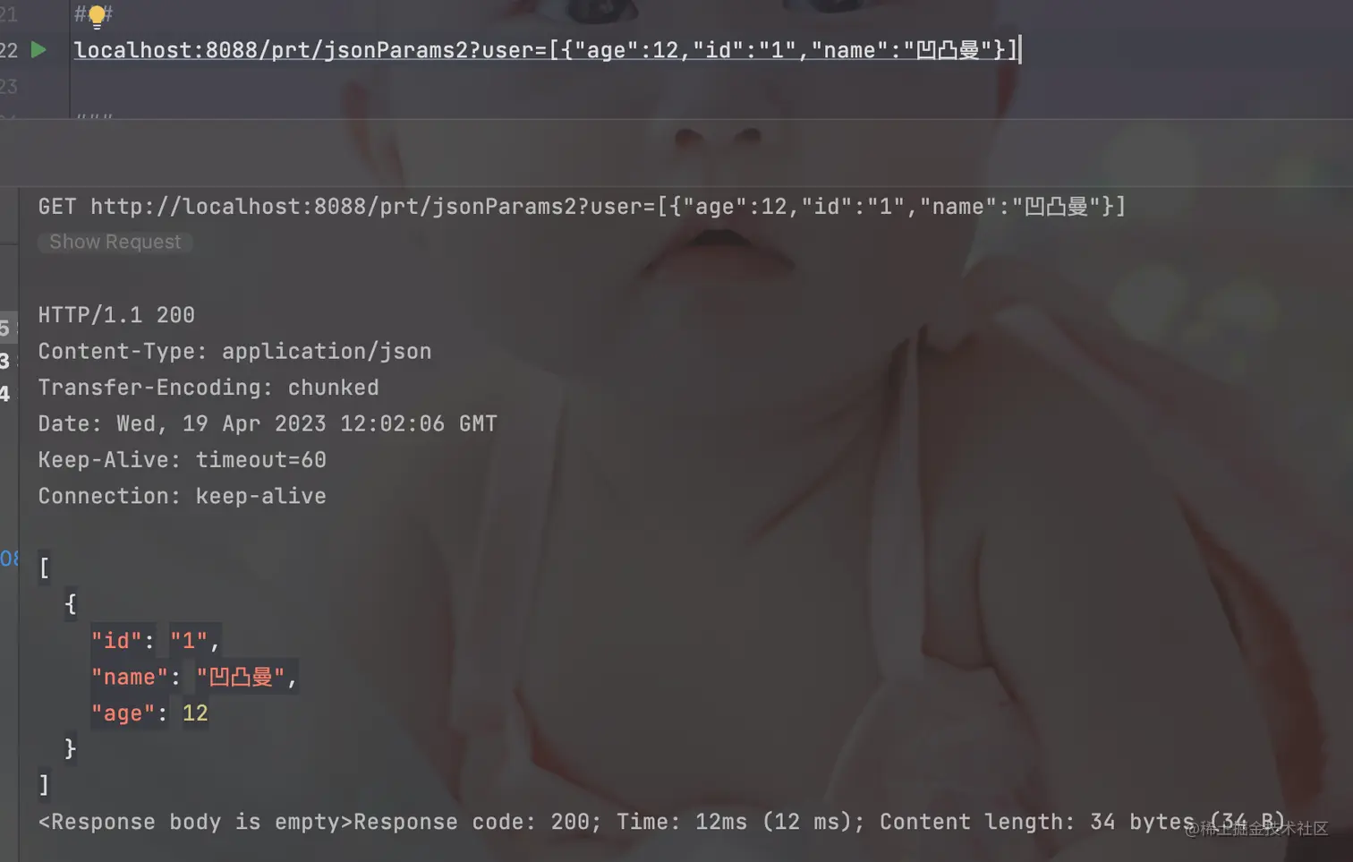localhost:8088/prt/jsonParams?user={"age":12,"id":"1","name":"凹凸曼"} 那么这种我们可能一般都是使用String接收,然后在调用转JSON的API进行处理。可是这种代码每个方法都去写的话,太不优雅了。毕竟:「温柔永不落伍, 优雅永不过时 」 。