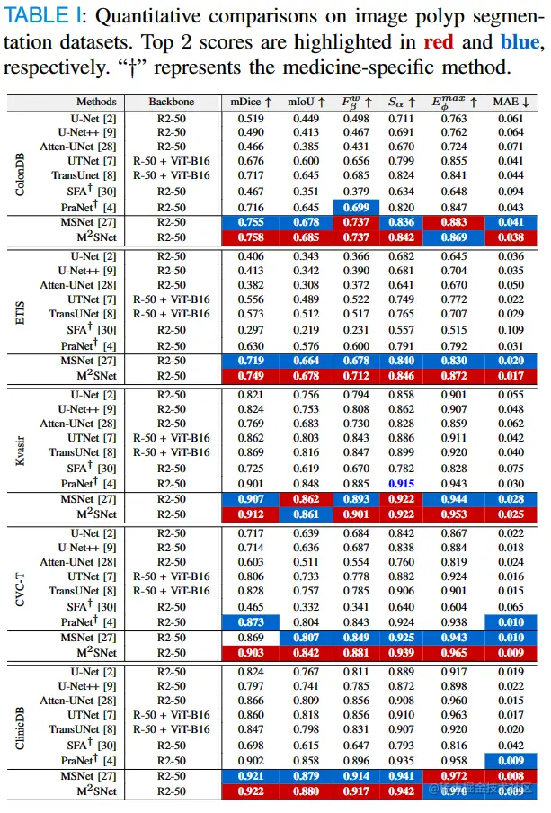 在5个息肉数据集上与其他 SOTA 方法对比,SNet在关键指标 mDice 上均获得了第一名。