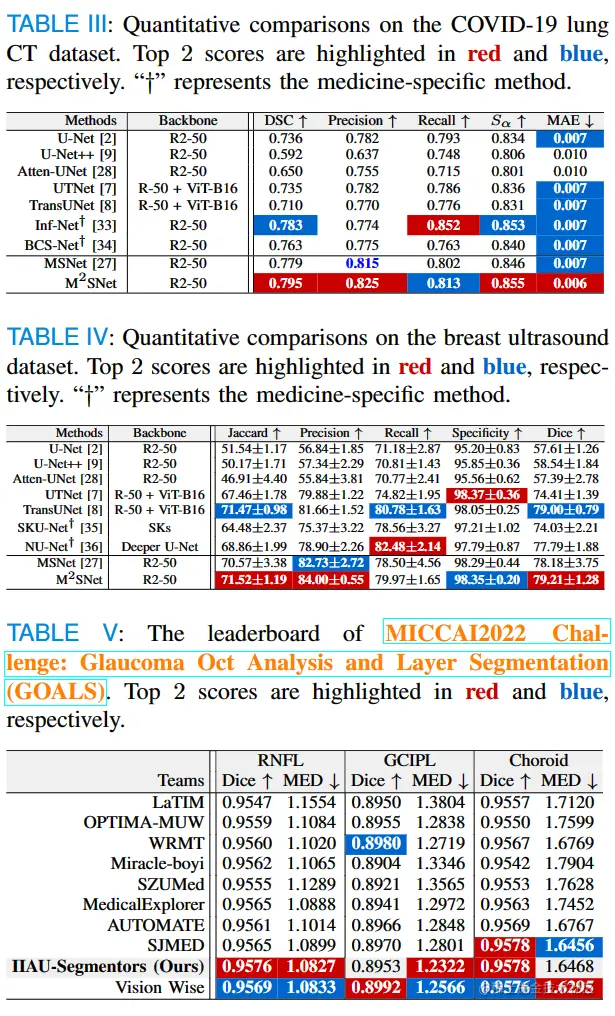 最后,本文还通过四个医学图像分割任务的实验验证了 的有效性,分别是息肉分割、乳腺癌分割、COVID-19 肺感染和 OCT 层分割。此外, 还在 MICCAI 2022 GOALS 国际眼科挑战赛中获得了第二名的好成绩。