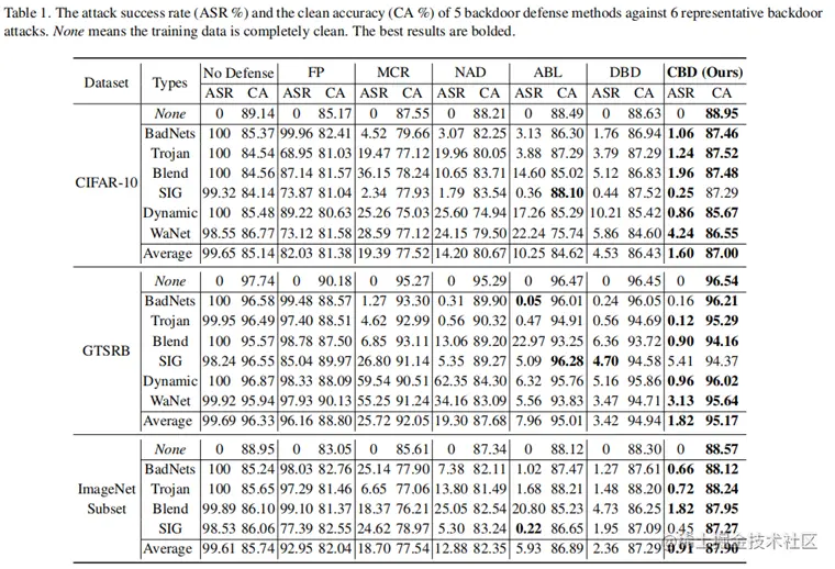 如上图所示,可以明显看出本文方法在多个数据集和6种常用的backdoor攻击下,都可以取得优越的防御效果。