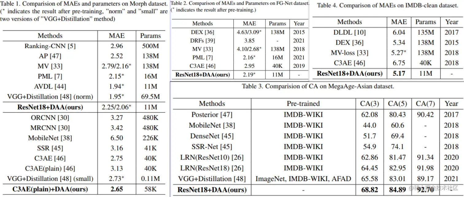 可以看到,本文方法在没有显著增加模型参数量的情况下取得了更精确的年龄估计结果。