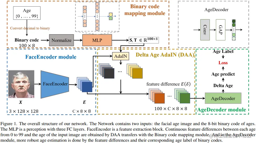 上图描述了一个年龄预测系统相关的架构,该框架基于深度学习和二进制编码映射技术所实现,共包含四个组件。下面带大家快速的过一遍,重点讲述 DAA 操作。