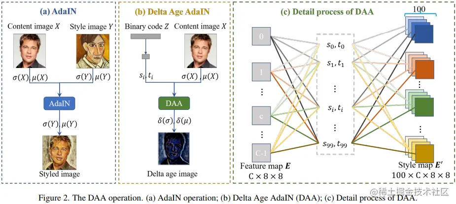 DAA 操作是该框架最为关键的一个组件。正如之前提到的,我们希望通过将当前图像与所有年龄段最具代表性的图像进行比较来估计年龄。然而,通常很难获得所有年龄段的典型特征信息。在风格迁移学习中,均值和标准差被认为是图像风格最具代表性的特征。受此启发,作者希望可以通过迁移学习获得每个年龄段的代表性信息。然后,通过将输入年龄的特征与迁移年龄的特征进行比较,得到了特征差异。这便是DAA操作的核心思想。