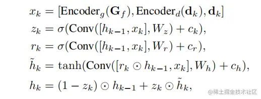 其中,为索引半径,表示池化操作。**这些几何特征和当前的视差预测通过两个编码器层,然后与连接形成。**然后使用ConvGRUs更新隐藏状态