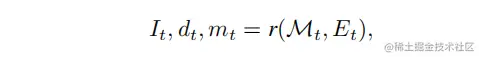 其中 是一个没有阴影的经典渲染光栅化函数,是渲染出来的图像,是渲染深度,是图像空间掩模,它标记了没有观察到的内容的像素。