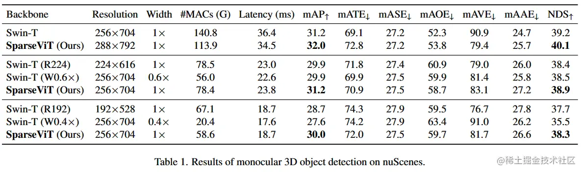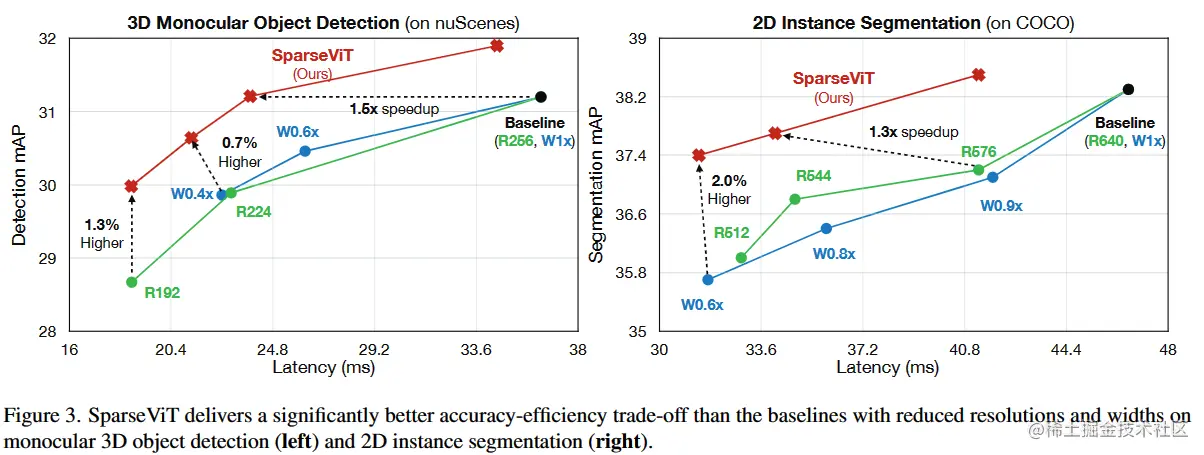 本文重新探讨了激活稀疏性在基于窗口的 ViTs 上的应用,并提出了一种新的方法来利用它。本文引入了稀疏感知自适应,并采用进化搜索来有效地找到最佳的逐层稀疏配置。结果表明,SparseViT 在单目 3D 目标检测、2D 实例分割和 2D 语义分割中实现了 1.5 倍、1.4 倍和 1.3 倍的测量加速,同时几乎不损失精度。希望本文能够激发未来研究探索使用激活剪枝来实现更高效、同时保留高分辨率信息的方法。