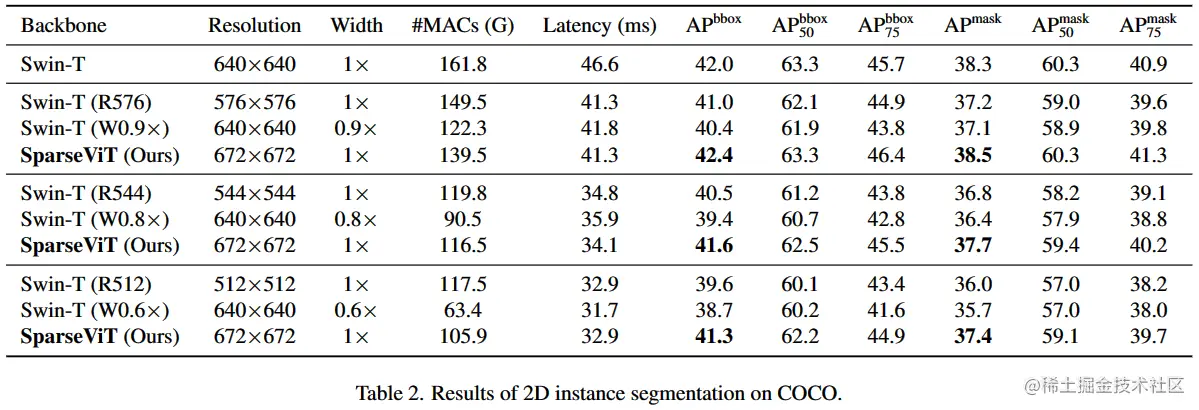 在 512×512 到 640×640 的各种输入分辨率下,SparseViT 的计算量始终优于 baseline。可以发现,从 672×672 的高分辨率开始修剪激活比直接缩小输入分辨率更有效。