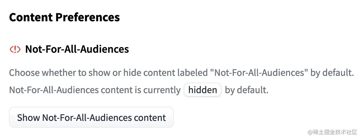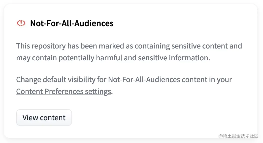 单击“查看内容”将允许你正常查看仓库。如果你希望始终在没有弹出窗口 not-for-all-audiences 的情况下查看标记的仓库 , 可以在用户的 Content Preferences 中更改此设置