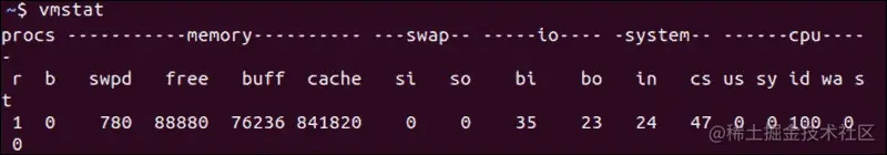 vmstat 命令是报告虚拟内存统计信息的有用工具。它的返回提供有关进程、内存、分页、块 IO、捕获和 CPU 活动的一般信息。