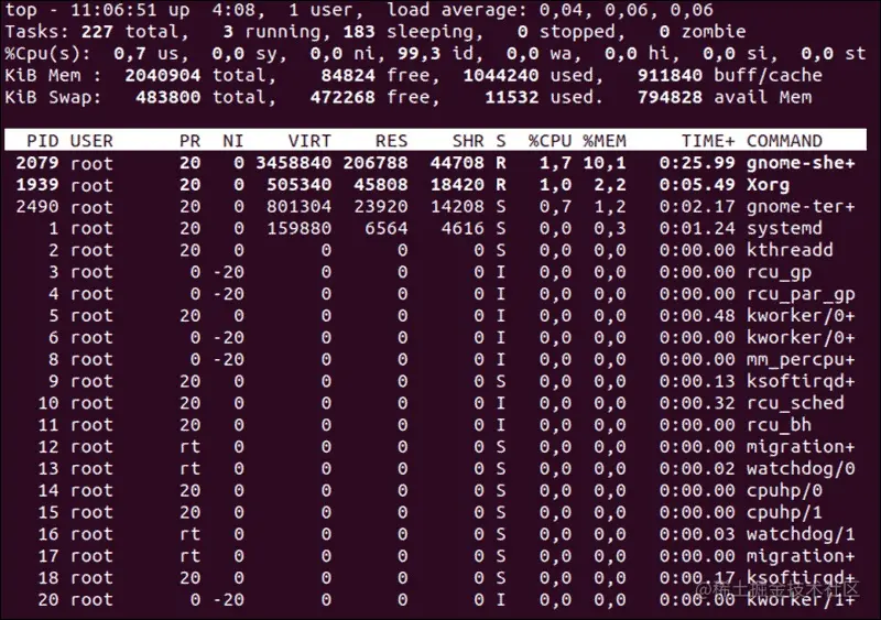 top 命令可用于检查每个进程的内存和 CPU 使用情况等。包含有以下信息: