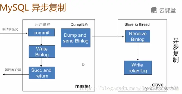 MySQL默认采用异步复制,不要求主从强一致而是最终一致。master节点写入即认为成功,不考虑slave是否接收并同步。