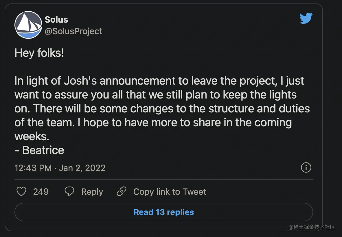 在这种群龙无首的情况下,今年 1 月 Solus 基础设施遭遇了一个硬件层面的问题,导致服务中断。这一中断,就是近三个月的时间,这个故障严重影响了 Solus 更新和交付软件包,以及 Solus 论坛上的交流或访问网站的功能,甚者导致了轻微的数据丢失。