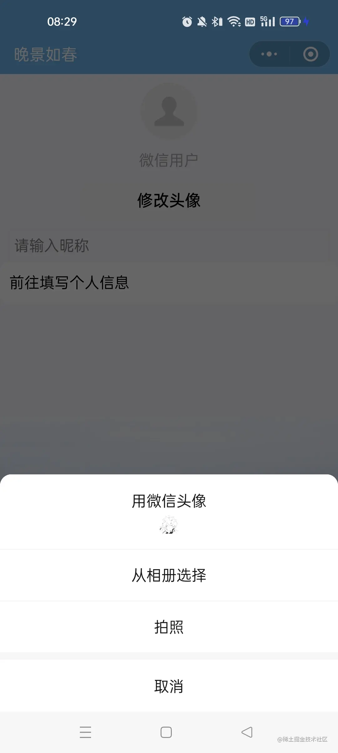 - 另外,如果只需要获取用户头像,可以直接调用微信提供的wx.getUserProfile()方法。