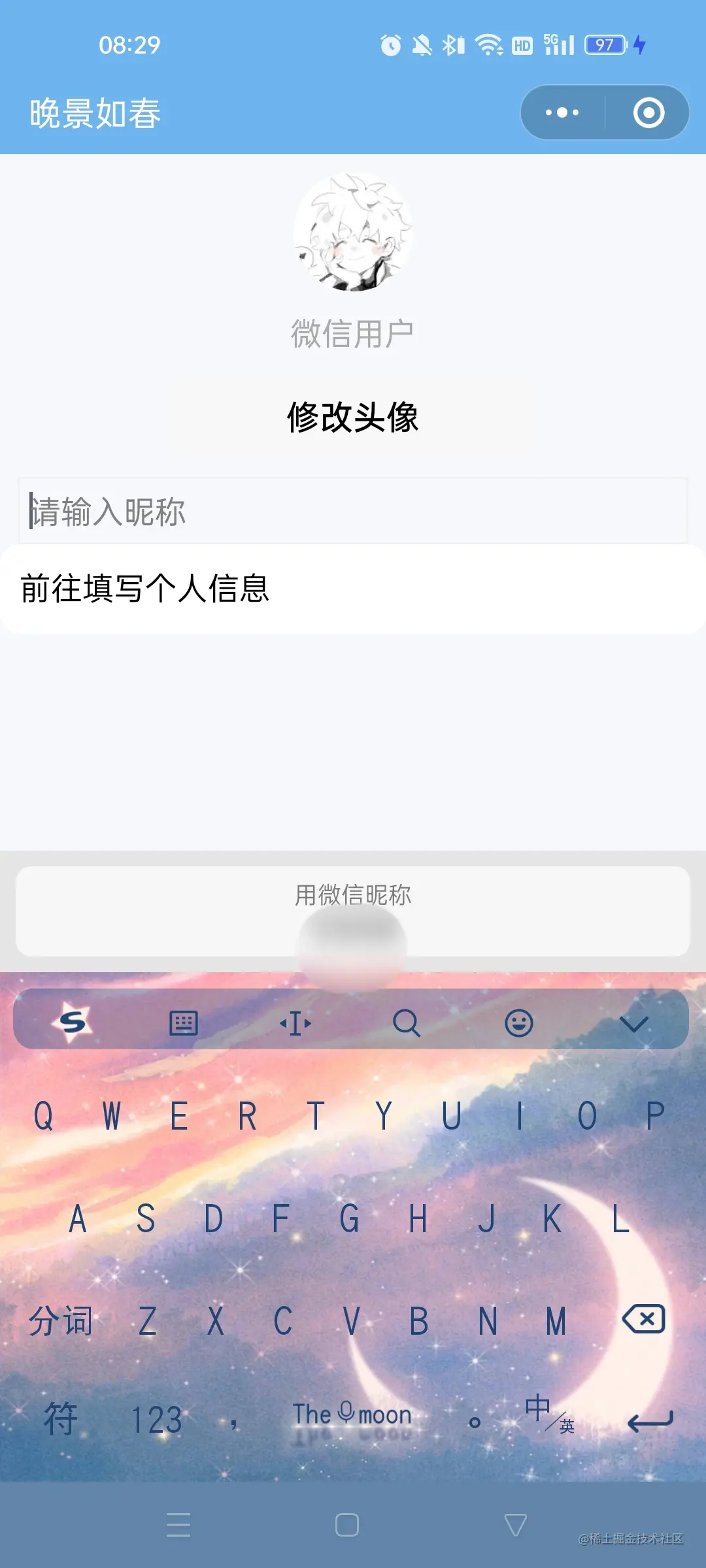 type的值设置为nickname,当用户在此input进行输入时,键盘上方会展示微信昵称。