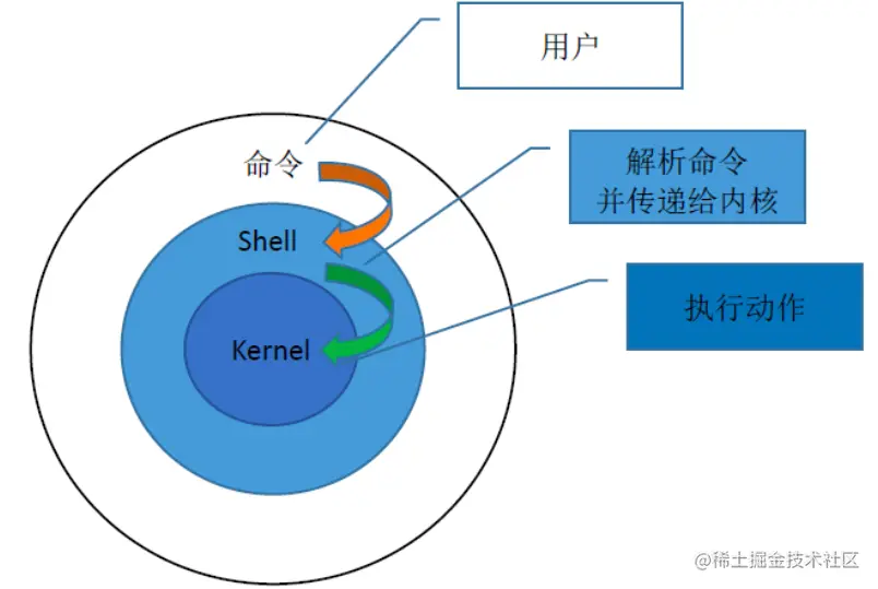 shell是一个C语言编写的脚本语言,它是用户与linux的桥梁,用户输入命令交给shell来处理,shell将相应的操作传递给内核,内核把处理的结果输出给用户。