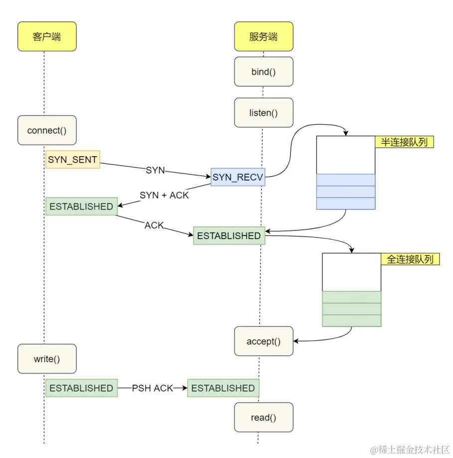 服务端收到客户端发出的 SYN 请求后,会把这个连接信息存储到半连接队列 (SYN 队列)。