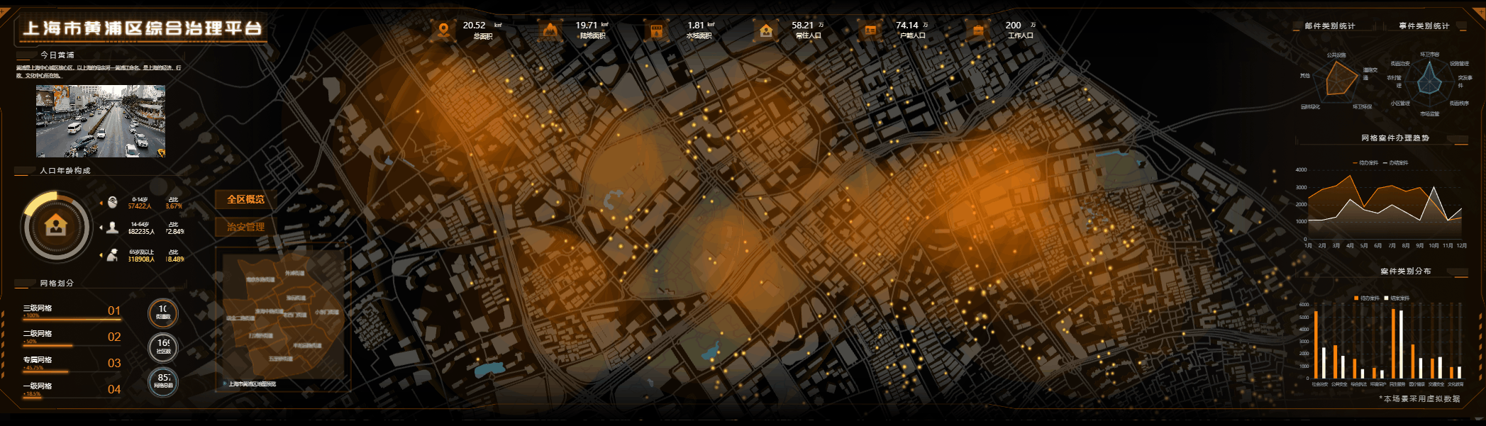 城市单元网格可视化:支持查看格网区域的地理名称、实际位置描述、物理属性及管理隶属等相关信息,展示网格内的人、物、事、组织等统计信息。