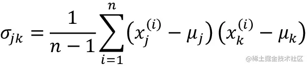 通过以上代码完成自主预处理后,我们进入第2步:构建协方差矩阵。对称的d×d-维协方差矩阵,其中d是数据集中的维数,存储着不同特征间的成对协方差。例如,特征xj和xk之间对总体的协方差可通过如下等式计算: