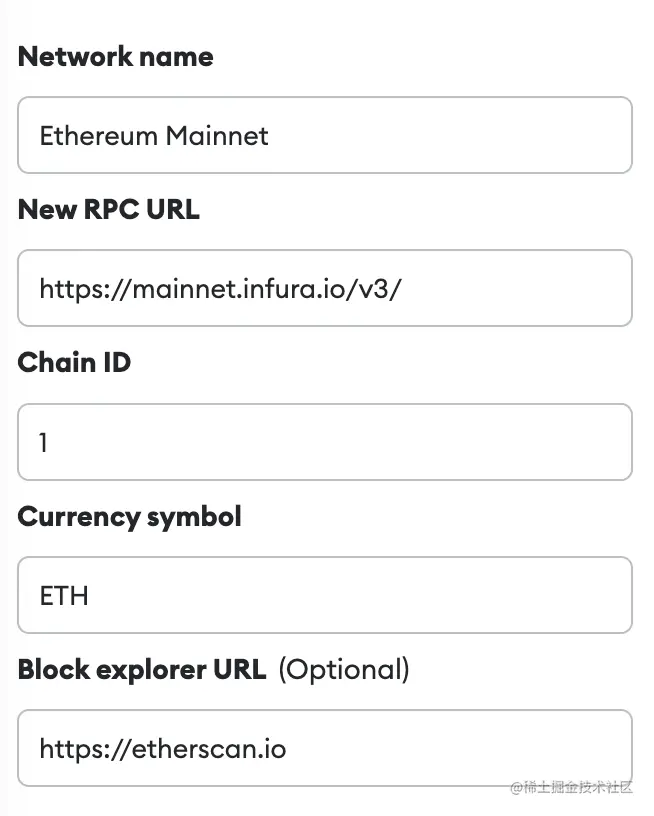小结一下,如下图所示,网络名称可以随便填写,代币的symbol也可以随便填写,浏览器的URL填写是可选的。但是一定要填写正确的RPC URL和 Chain ID。下图是以太坊主网连接的截图,但是通常大部分的应用都支持以太坊,所以我们不需要主动去填写主网的网络信息,也是谨防我们填写错误被钓鱼网站恶意钓鱼了。在更多情况下,如果应用没有默认填写有我们需要在这条链上做应用的连接网络信息,我们只需要去官方的网站即可查询得到。记住,一定是官方的网站。