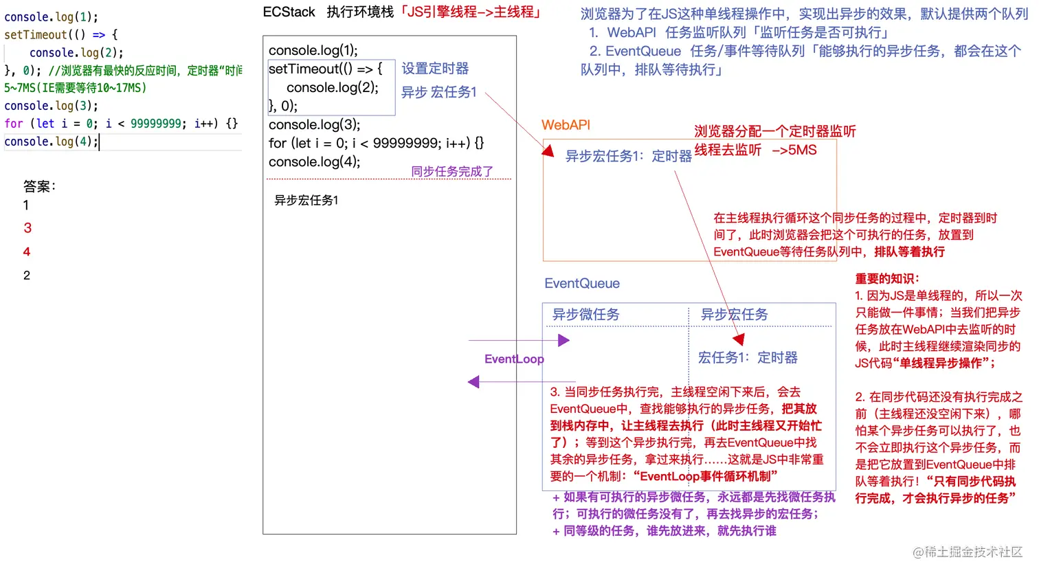 3)当同步任务执行完,主线程空闲下来之后,会去EventQueue中,查找能够执行的异步任务,把其放到栈内存中,让主线程去执行(此时主线程又开始忙了);等到这个异步执行完,再去EventQueue中找其余的异步任务,拿过来执行...这就是JS中非常重要的机制"EventLoop事件循环机制"