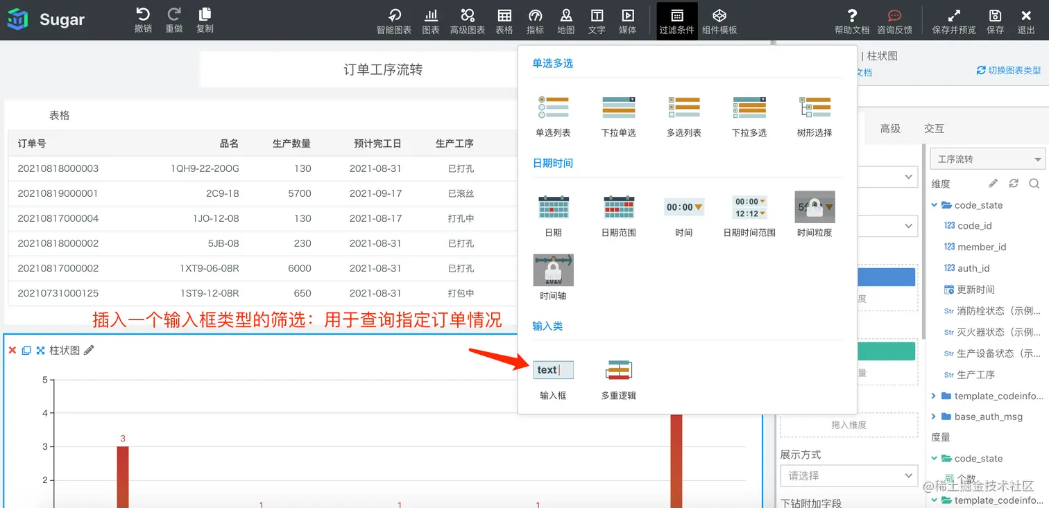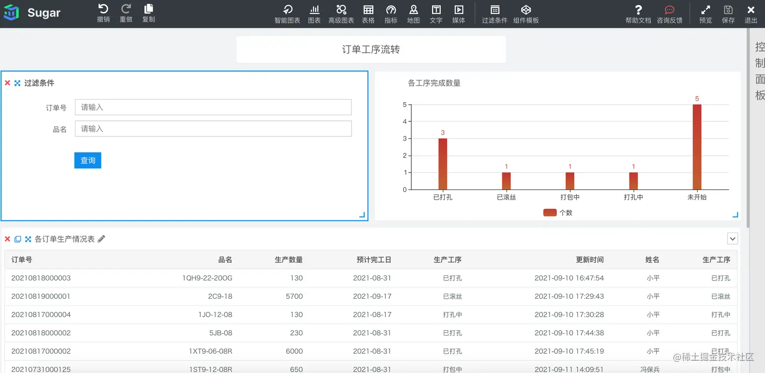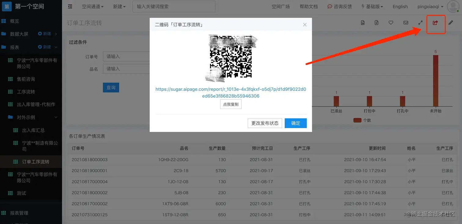 使用外部数据分析工具,比如百度Sugar,连接草料二维码官方数据库,即可制作自定义可视化报表。本文会具体介绍订单工序流转报表的制作流程。