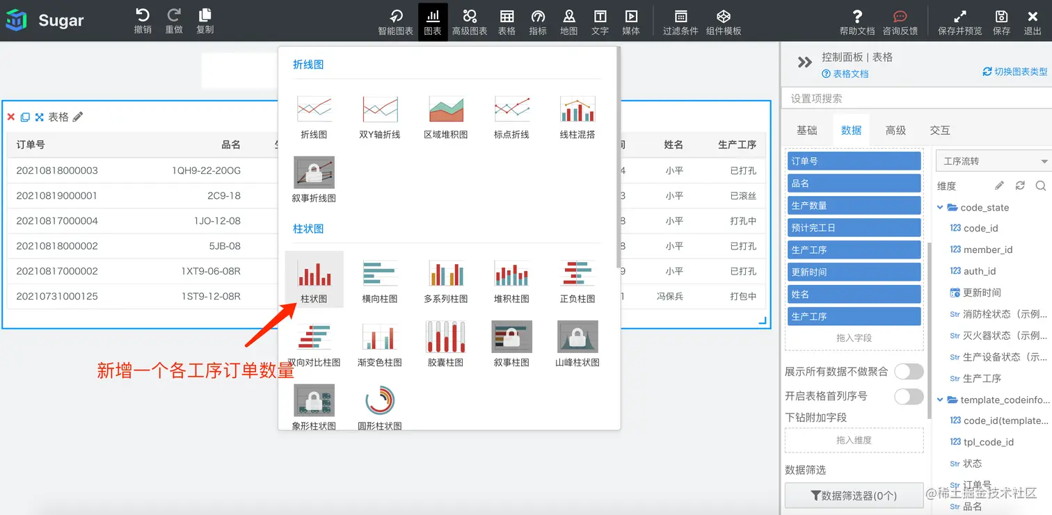 再选择图表,这里我们可选择常用的柱状图,来显示各工序完成的订单数量分布
