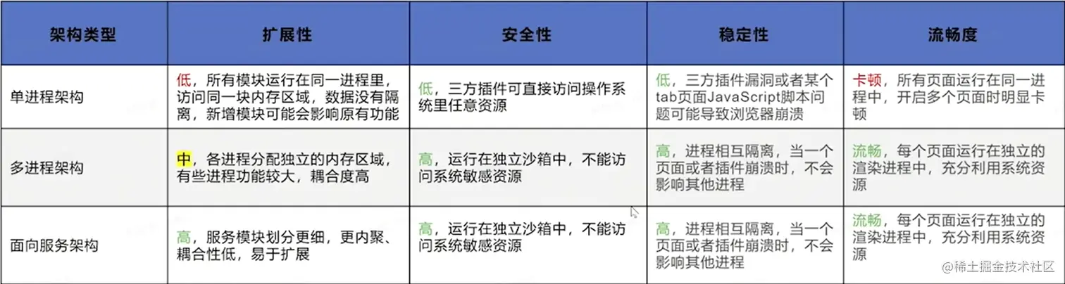 - 单进程架构:所有模块运行在同一个进程里,包含网络、插件、js运行环境等