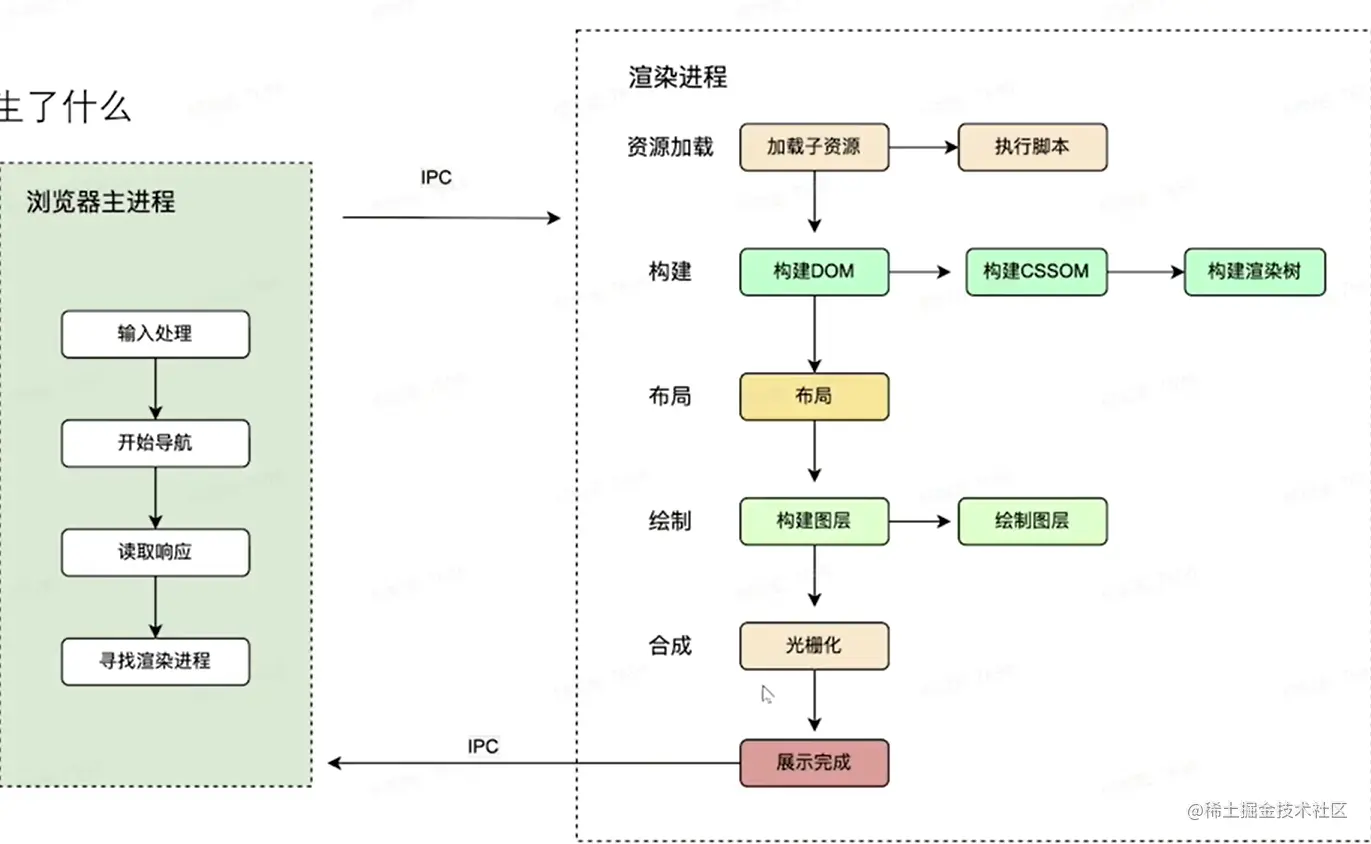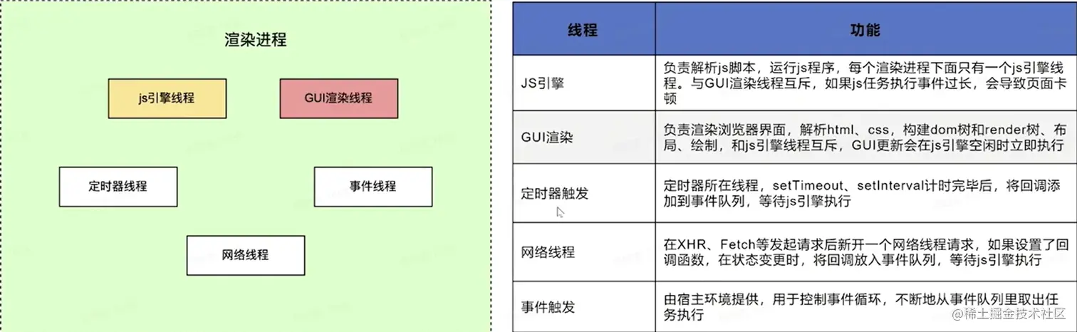 渲染进程内部是多线程实现,主要负责页面渲染、脚本执行、事件处理、网络请求等