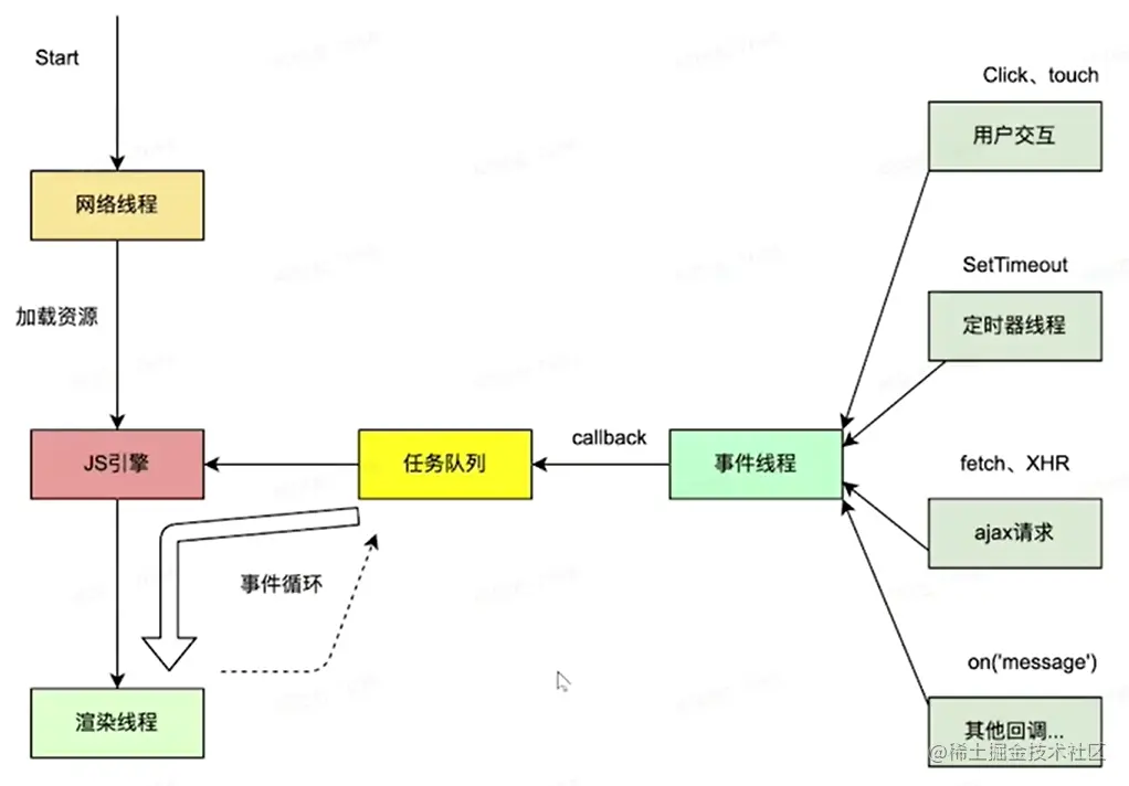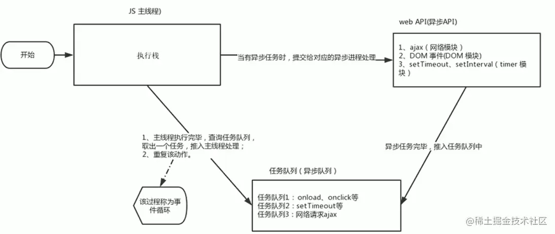 - 事件进程进行事件循环,将队列里的任务取出交给js引擎执行
