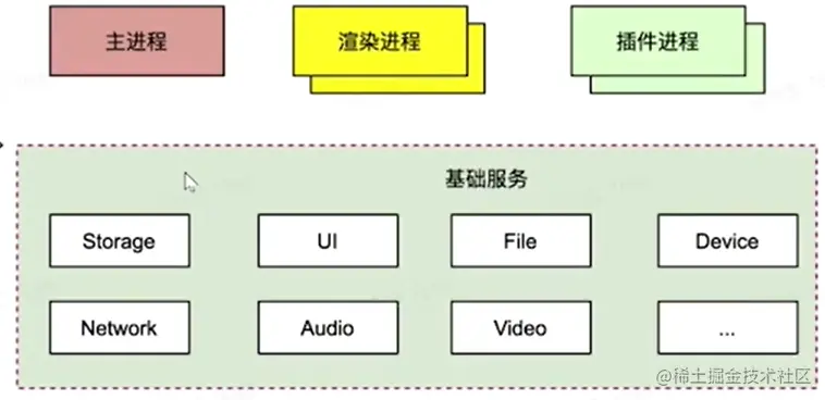 - 面向服务架构:将原来的UI、数据库、文件、设备、网络等,作为一个独立的基础服务。多进程架构升级版
