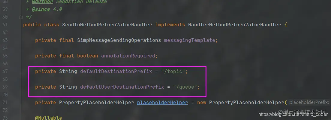 这个属性的配置用来路由各种消息,分别路由到已配置项为前缀的订阅消息中,其中注意【/】不能忽略,否则路由失效。配置有broker之后,你会发现以【/topic】为前缀的依然有效。查看源码你会发现,源码中有两个默认路由规则:【/topic】【/queue】