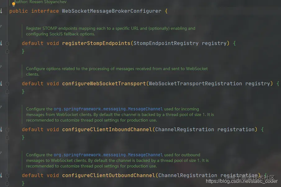 所以直接实现 WebSocketMessageBrokerConfigurer 这个接口,重新需要的方法即可。