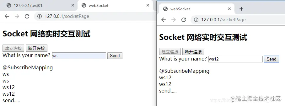 - @SubscribeMapping 是客户端订阅的消息请求,当建立socket连接时,订阅的消息请求会通过 @SubscribeMapping 获取该方法下的消息,返回在客户端。